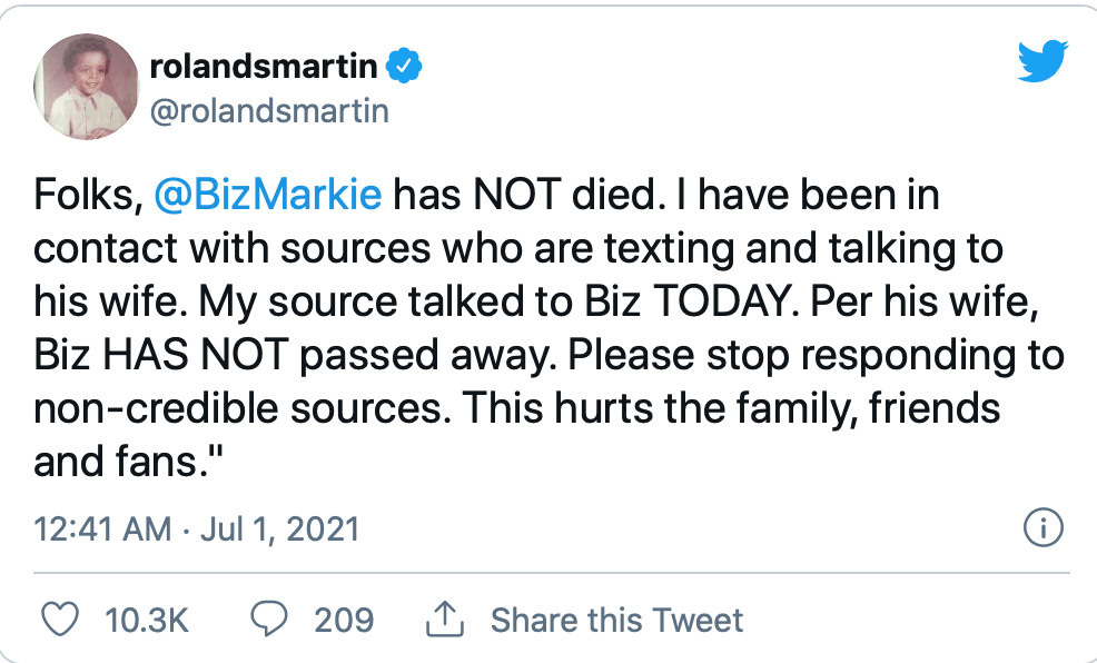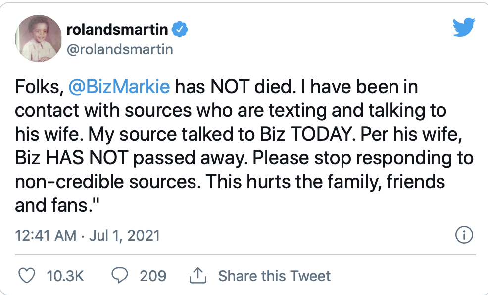 TV One journalist Rolands Martin also confirmed Biz is still alive, tweeting, “Folks, @BizMarkie has NOT died. I have been in contact with sources who are texting and talking to his wife. My source talked to Biz TODAY. Per his wife, Biz HAS NOT passed away. Please stop responding to non-credible sources. This hurts the family, friends and fans.”